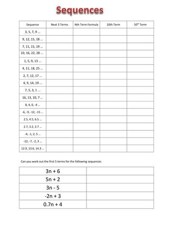 Sequences - WorksheetMath Sequences - WorksheetMath Sequences Skip counting Fill in the missing values by skip counting. Describing sequences Describe each sequence by giving the first term, and the common difference. Finding the terms of a linear sequence Use the nth term formula to find the terms of a linear sequence. Finding the terms of a quadratic sequence